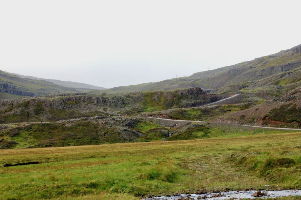 Unten am Fjord vor dem Öxipass (unbefestigt) scheint noch die Sonne. Oben sehen wir schon Nebel. Die Straße ist sehr schlecht mit vielen 20cm tiefen Löchern, die aufgrund der Regenfälle alle voll Wasser sind. Die Mietwagentouris brettern an uns vorbei, als würden sie an einem Rennen teilnehmen – ist ja nicht ihr Auto. Es geht zum Teil sehr steil hinauf und einige der Wohnmobilspezialisten schaffen es kaum mit ihren Sommerreifen.