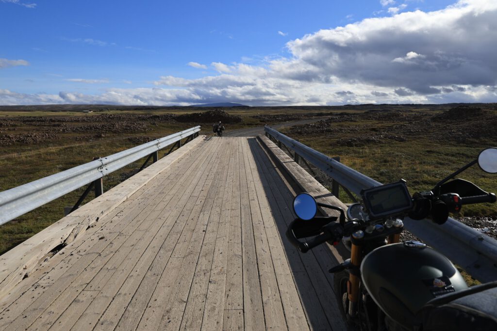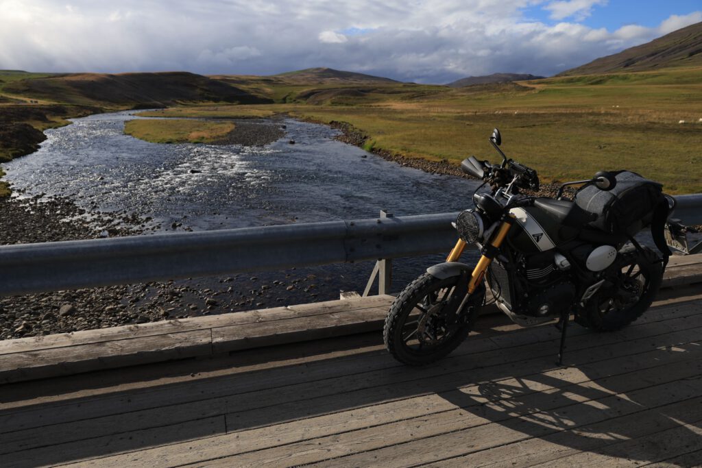 Dafür wurde meine Triumph nicht gebaut. Die vordere Upsidedown-Gabel federt zu wenig ein für die riesigen Steine. Es geht sehr auf die Handgelenke und Schultern. Einige kleinere Flußdurchquerungen – kein Problem. Auf der gesamten Strecke immer wieder mega schwarze Wolken, aber der starke Wind bläst die zum Glück immer wieder weg. Dann nochmal 40km top geteerte Straße und ab ins 14 km lange Tunnel. Dort trocknen unsere Schuhe (bei den Flussdurchfahrten spritzt doch immer mal Wasser auf die Schuhe) fast wieder bei den mind. 40° was es im Innern hat. Trocken angekommen auf dem Campingplatz fängt es auch schon zum tröpfeln an.