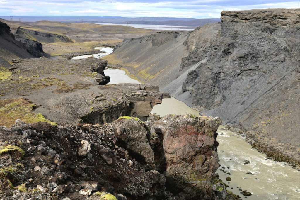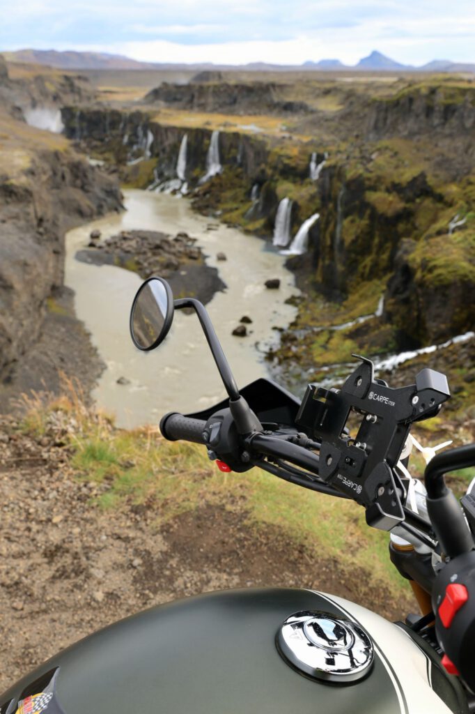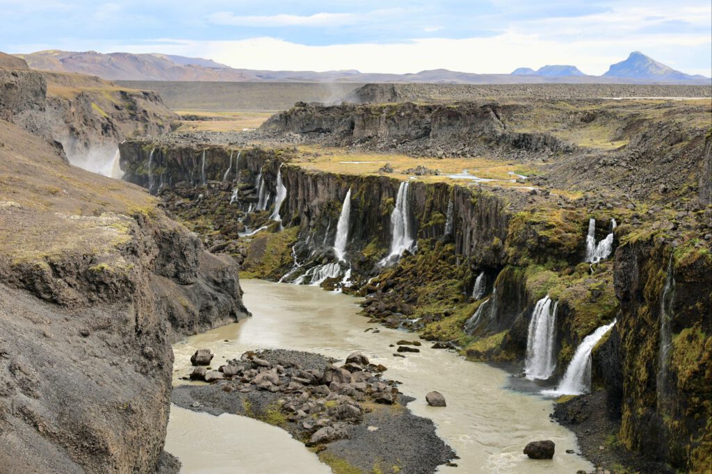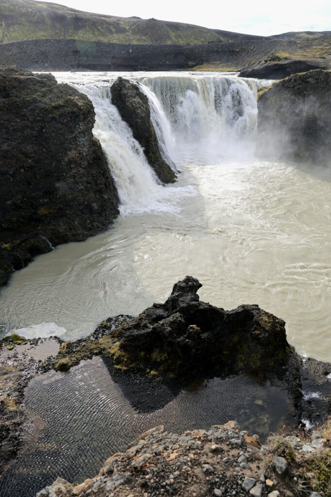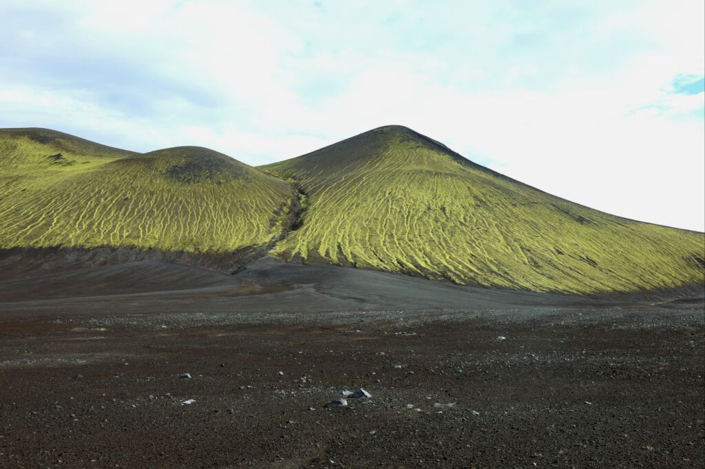 Zuerst die 26er weiter und dann rechts abgebogen auf die 208er, da beginnt eine der besten Landschaften, die wir in Island gesehen haben. Kahle Berge, Lavafelder, Seen und schroffe Felsen, die leuchtend grün mit Moos bewachsen sind. Und natürlich überall kleine und große Wasserfälle