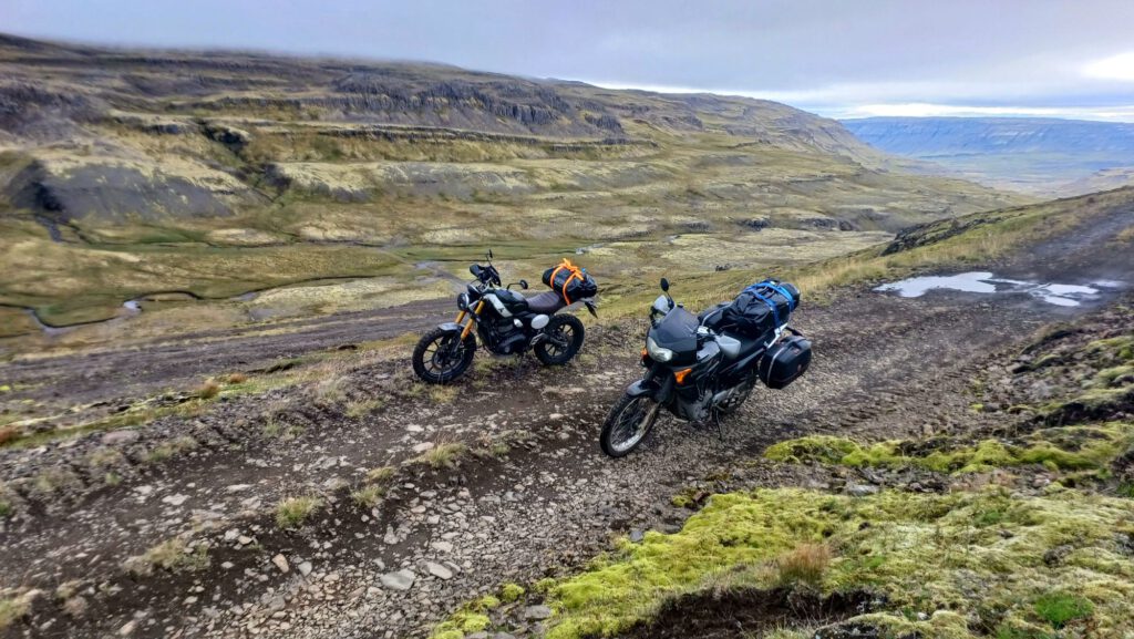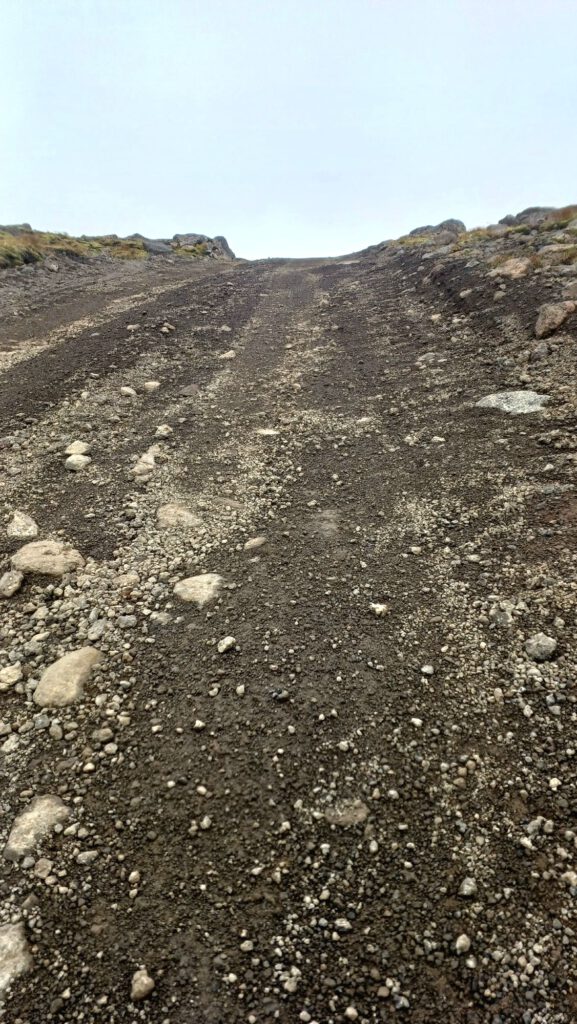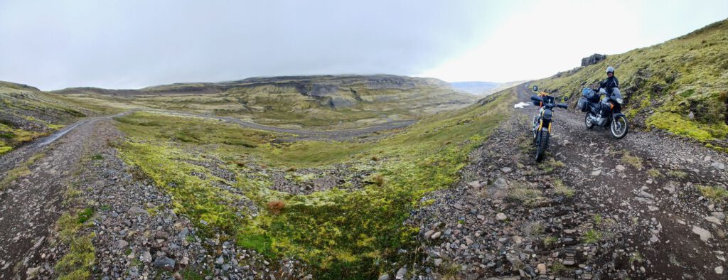Dann die Abzweigung nach rechts auf die F66 – DANGEROUS ROAD – steht im Internet. Wir biegen trotzdem ab 🙈🫣. 24km Offroad. Zuerst grobe Steine am Bachlauf entlang, ein paar kleinere Bachüberquerungen. Ein Allrad Landrover kommt uns entgegen. Wir fragen, wie hoch  die Wasserstände bei den Flussüberquerungen sind. Kein Problem, meint der Fahrer für Motorräder, aber teilweise etwas rutschiger Lehmboden. Also weiter. Der rutschige Lehmboden erweist sich als Schlammschlacht. Steil den Berg rauf