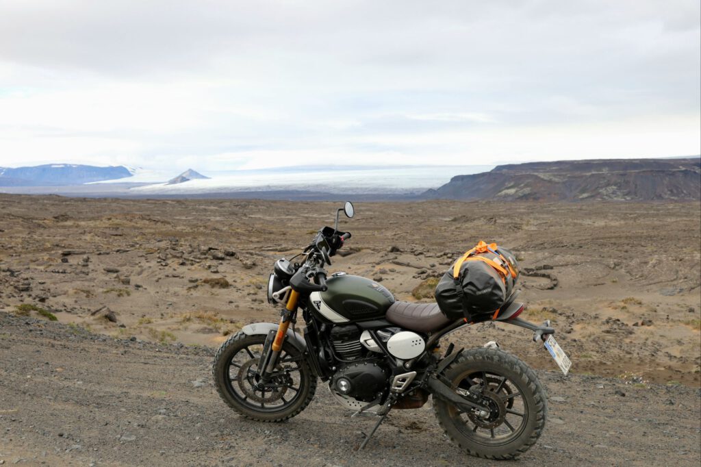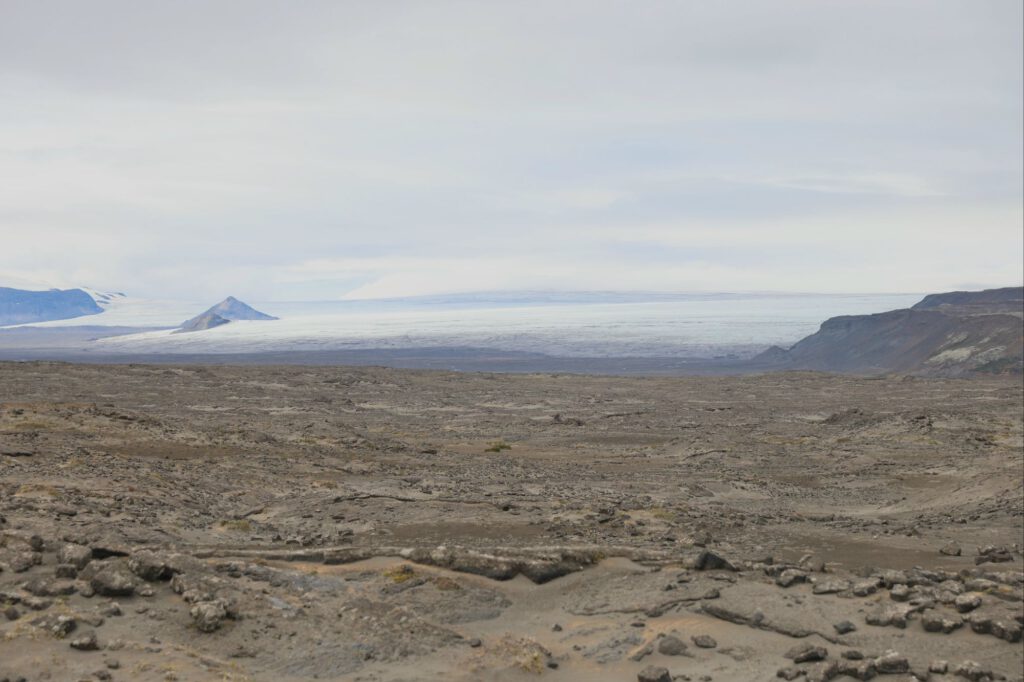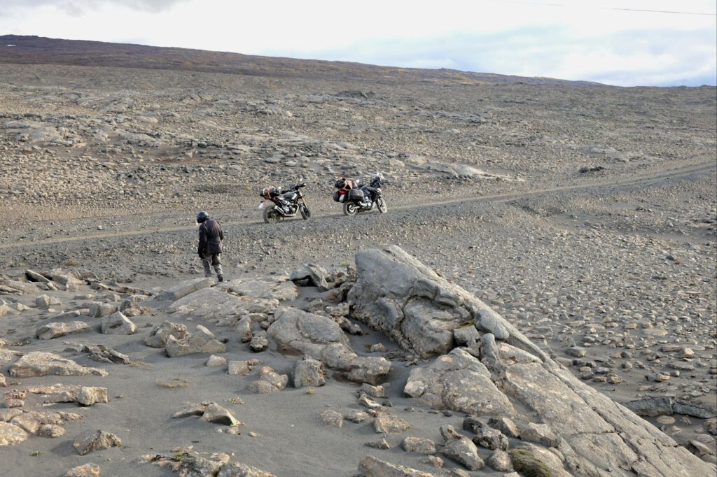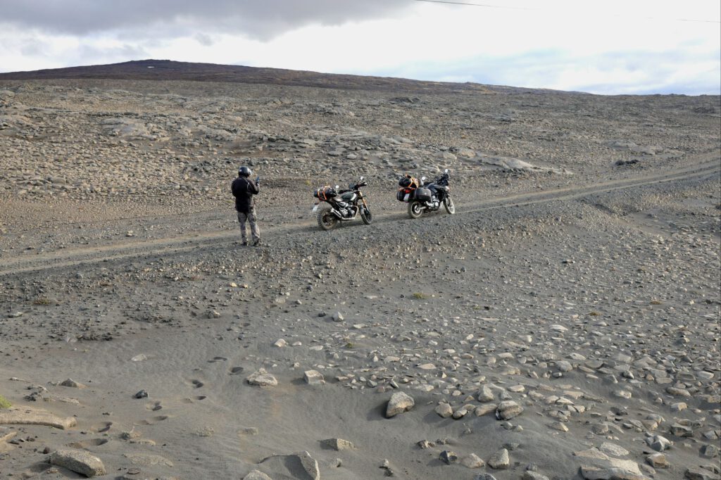 Wir entschließen uns, nicht zwischen den Menschenmassen zu campen, tanken und zweigen auf eine F- Route ab. Als F- Routen werden hier die, nur mit Allrad Geländefahrzeugen befahrbaren Straßen bezeichnet. Gleich am Beginn steht das entsprechende Schild 4×4. Gleich darunter aber diesmal ein rundes Schild mit einem durchgestrichen Motorrad. Wir wissen nicht genau was das bedeutet und fahren weiter. 75 km schwierig zu befahrende Strecke mit Serpentinen über Lavafelder bis kurz vor die Gletscherzunge – Belagskörnung 0,1 mm bis 20 cm, gemischt oder auch mal hintereinander. Es war sehr anstrengend, aber auch für Einradantrieb machbar. Es kommen uns tatsächlich 2 große 4×4 Fahrzeuge auf der gesamten Strecke entgegen – wir haben die Menschenmassen abgeschüttelt.