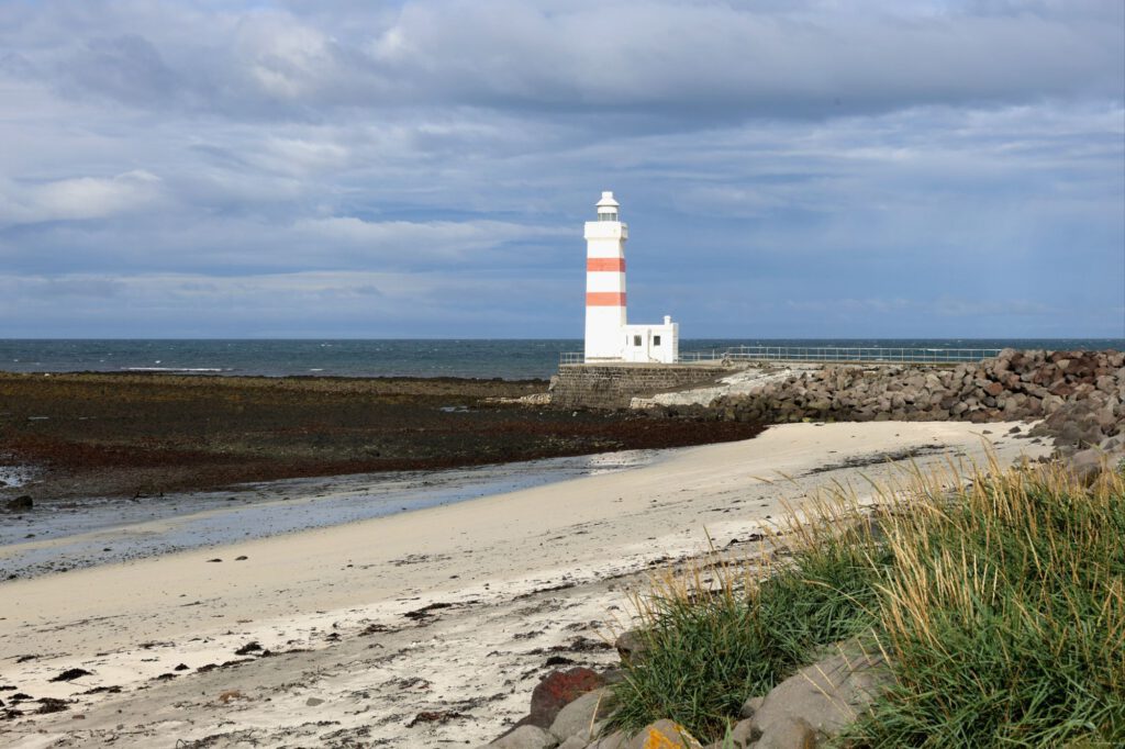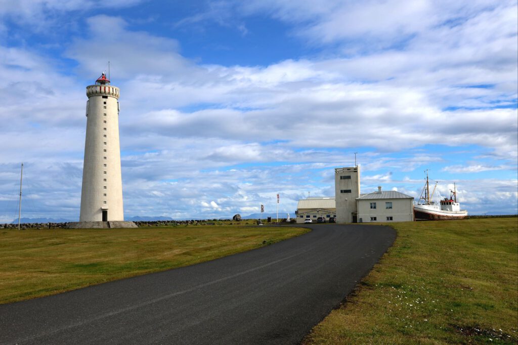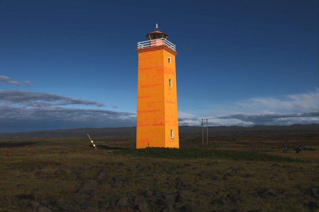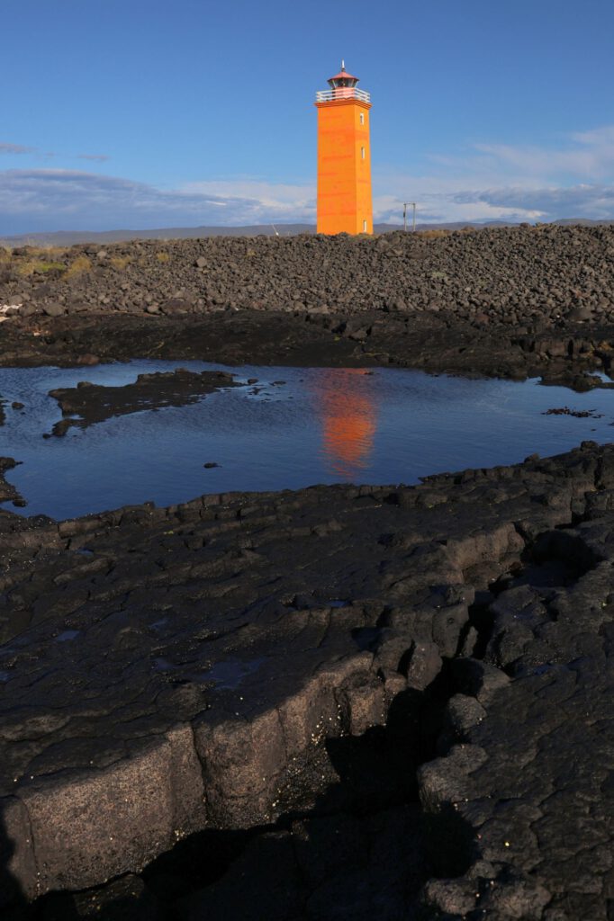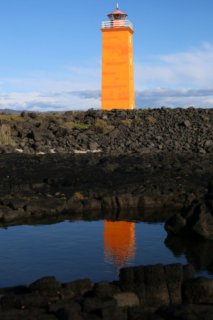 Als wir um 7:30 Uhr aufstehen scheint die Sonne. Wir laden die Motorräder aus, frühstücken und fahren los. Wir wollen die Halbinsel unterhalb von Reykjavik erkunden. Ein orangefarbene Leuchtturm – wir biegen links auf die Schotterstraße ab