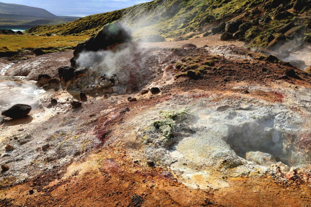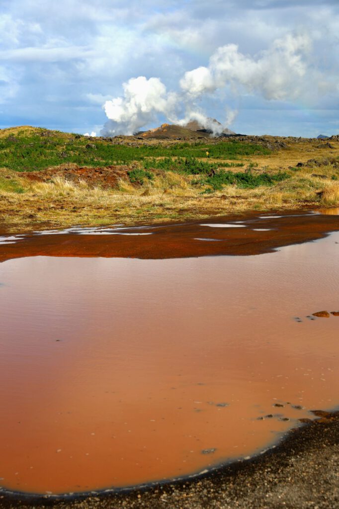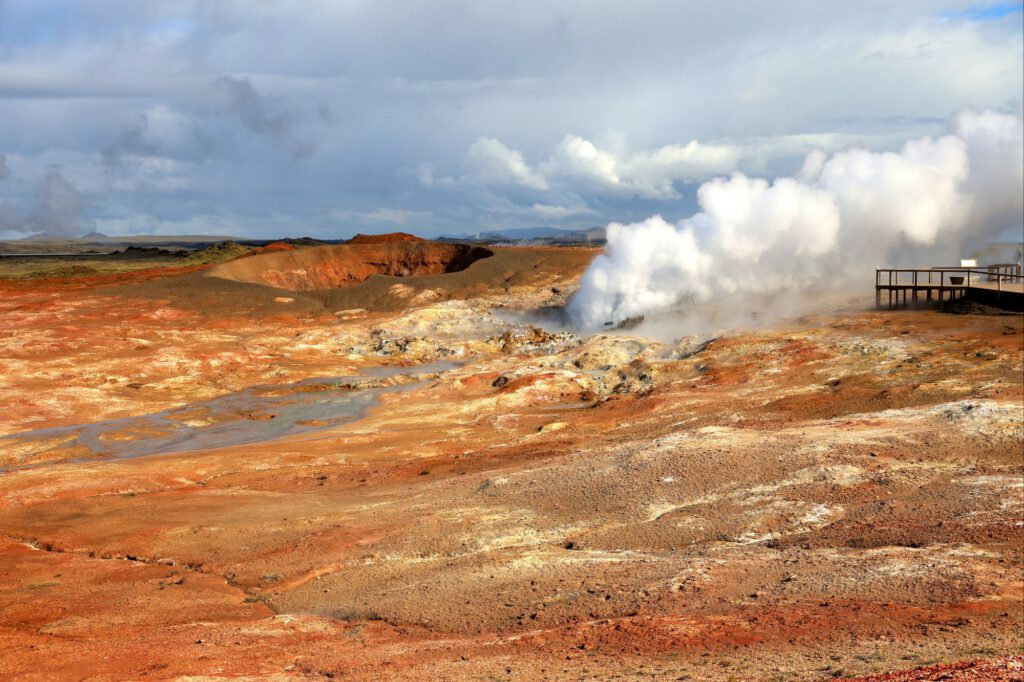 Abbiegen auf eine Geothermalfeld. Es brodelt und raucht überall aus dem Boden