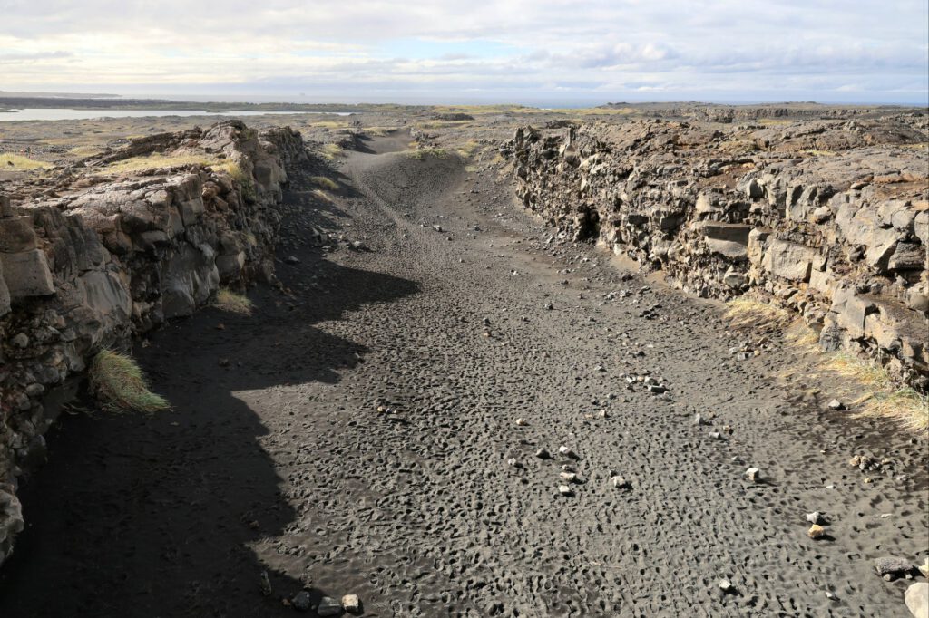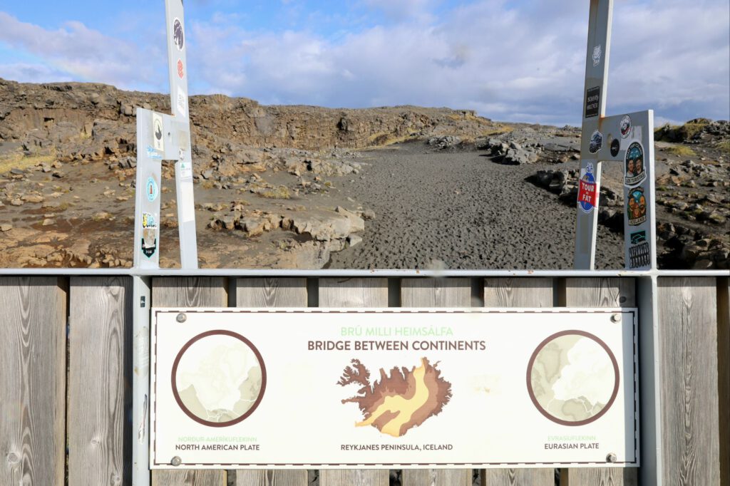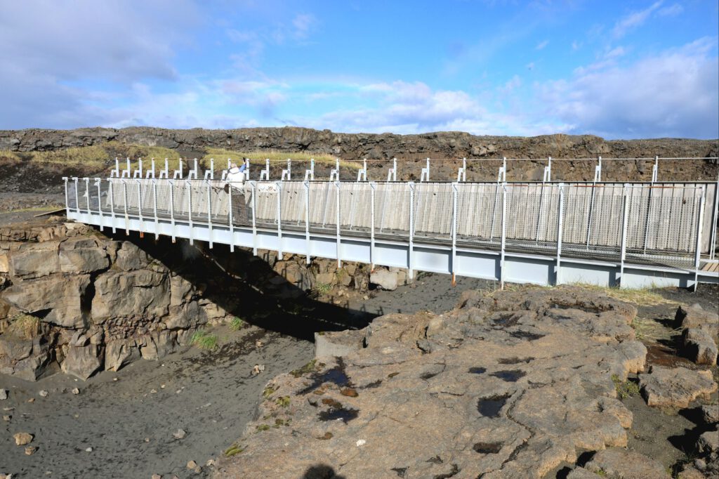 Die Brücke verbindet die europäische Platte mit der amerikanischen Platte. Die beiden Platten driften auseinander und der Spalt eindeutig größer