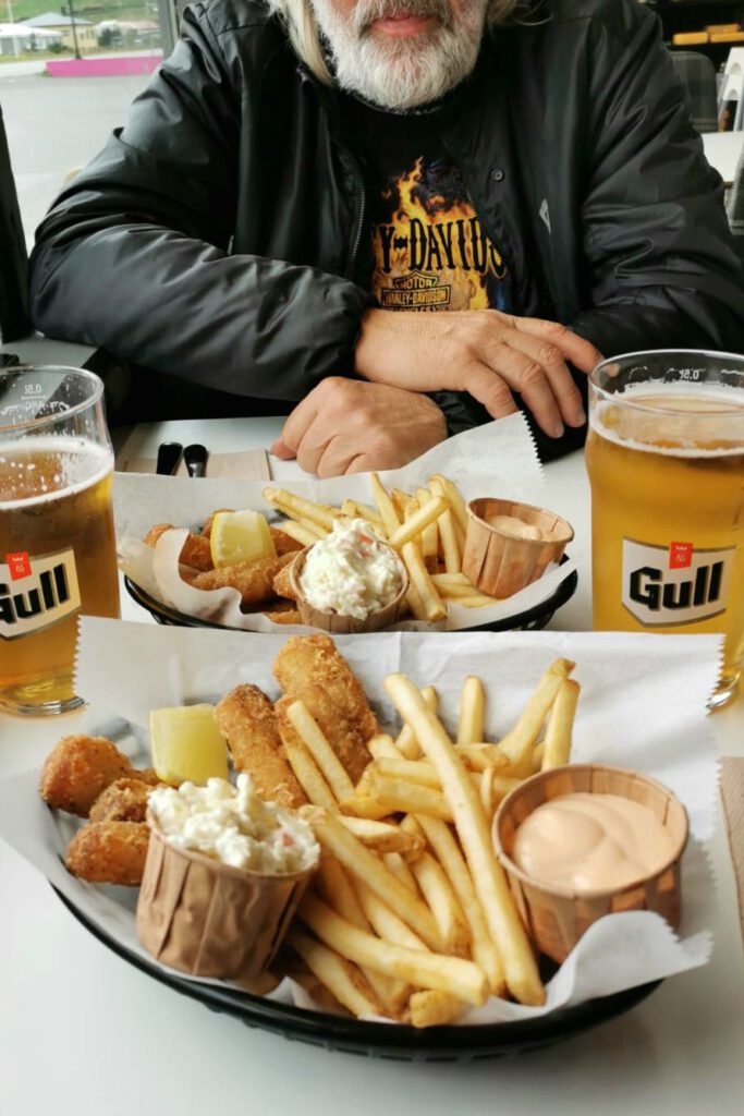 Danach gleich ins Tankstellen Restaurant gelaufen (man weiß nie so genau, wann die schließen) und Fisch & Chips mit Bier vom Fass bestellt.